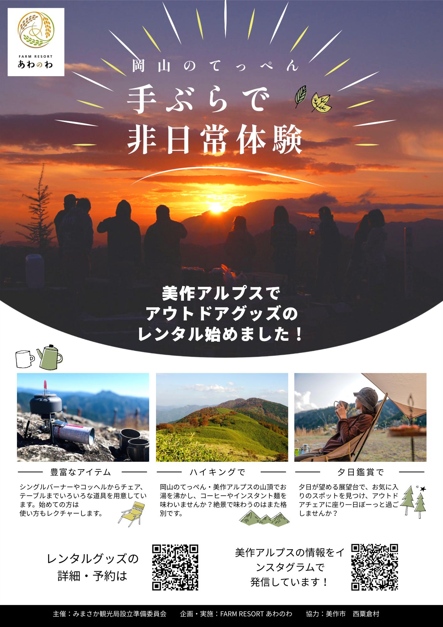 美作アルプスの絶景を気軽に楽しんでいただくため、アウトドアグッズのレンタルを始めました。手ぶらで非日常を体験しよう!