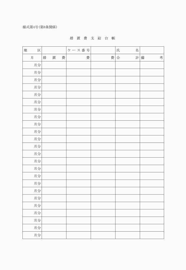 第8条 福祉事務所長は、法第11条第1項の規定により措置した者(以下「被措置者」という。)につき、措置台帳(様式第1号)を作成し、常にその記載事項について整理しておかなければならない。