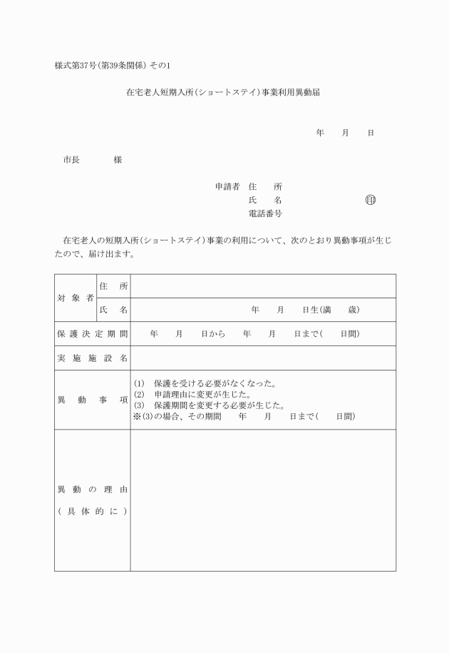 第37条 ショートステイを利用しようとする者は、入所を希望する実施施設へ利用券を提示するとともに在宅老人短期入所(ショートステイ)事業利用申出書(様式第35号)を提出しなければならない。