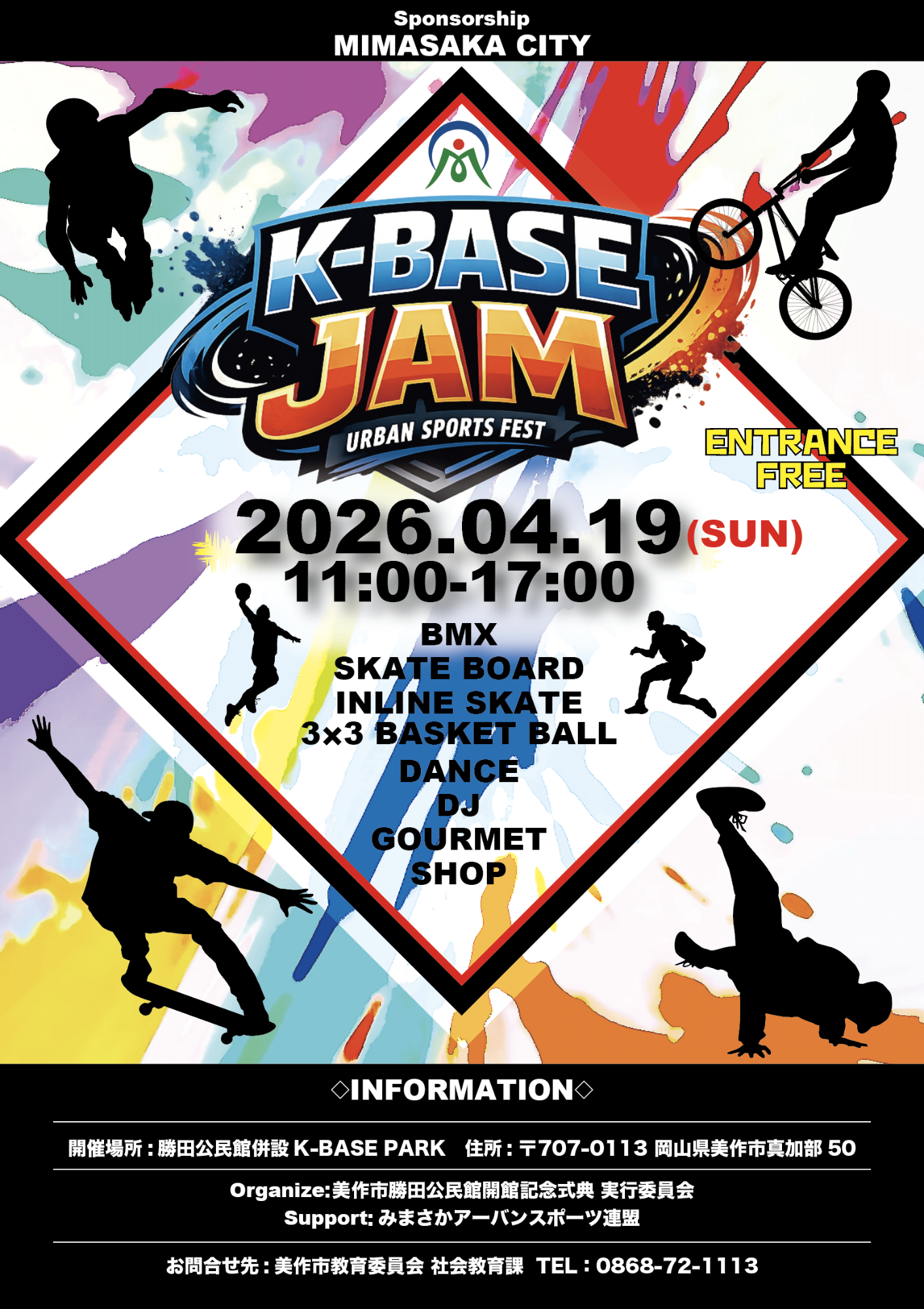 美作市の新たな注目スポットであるアーバンスポーツ施設「K-BASE パーク」を会場に、BMX、スケートボード、インラインスケート、3×3バスケットボール、ダンスなどのショーケースイベントを開催します。